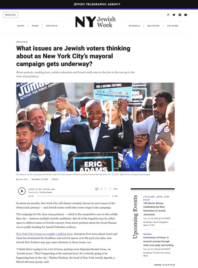 The campaign for the June 2024 primary — which is the competitive race in this solidly blue city — features multiple Jewish candidates. But all of the hopefuls may be called upon to address issues of Jewish concern, from street protests about the Israel-Hamas war to public funding for haredi Orthodox yeshivas.